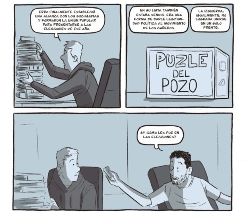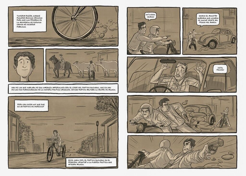 Pero lo que realmente resulta interesante es contemplar cómo se va forjando el carácter del futuro presidente desde su juventud, desde sus lecturas, sus viajes, sus vivencias. También de los motivos de sus tres entradas en la cárcel, las dos primeras con sendas fugas espectaculares, y la tercera, que le llevó a la incomunicación total durante doce años (dos de ellos ubicado en un pozo, literalmente, recibiendo todo tipo de torturas físicas y mentales que se pudieron ver en la película La noche de los 12 años (2018), dirigida por Álvaro Brechner). Formó parte del Movimiento de Liberación Nacional-Tupamaros, creado a mitad de la década de los sesenta, y convertido en una guerrilla urbana al responder a las provocaciones y ataques de la ultraderecha (llegó a recibir seis tiros en una de sus escaramuzas). En la novela gráfica destacan titulares de periódicos de la época que corresponden a bulos, acciones abusivas de la policía reprimiendo manifestaciones pacíficas y políticos corruptos alimentando lo que, años después, desembocaría en el golpe de Estado militar.