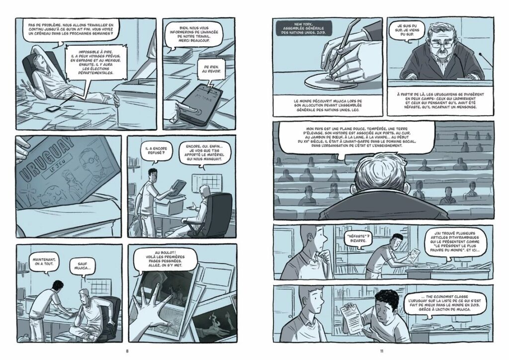 Los dos autores, Castro y Trinidad, son tan sinceros que dibujan también sus pequeños ataques de ansiedad ante las dudas de si se entenderá su obra o si le gustará al propio Mujica, a pesar de manifestar (y documentar al final de la obra) una gran cantidad de bibliografía consultada. Además, la novela gráfica acaba con una página dedicada con los agradecimientos de los dos autores, en concreto a “Paco Roca, Étienne Davodeau y Sarah Glidden, porque sus trabajos fueron parte fundamental de la inspiración que nos ayudó a dar con el punto de vista y el tono de este libro“. La frase es un reconocimiento evidente a la importancia no sólo de lo que se explica, sino de cómo se explican las historias, y el reconocimiento a nuestros maestros y a nuestras influencias.