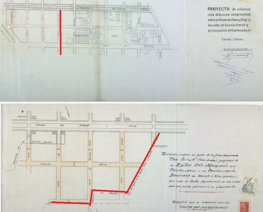 Al final, en lo concerniente a la Jota, su contribución no era tan cuantiosa, centrándose más bien en lo próximo a Virrei Amat. De hecho, en los papeles consultados se distingue con nitidez como sólo la calle de Emili Roca se enmarcaba en lo concebido con anterioridad a causa de los límites rurales de los dos blasones. Los colaboradores de la marquesa querían rubricarlo como Can Sitjà, pero ni siquiera eso se cumplió durante el otoño de los años veinte, pues para la administración su nomenclatura debía adaptarse a la tejida en el barrio de Salvador Riera, los mal llamados segundos Indians, de ahí ese toparse con Acacias, por el deseo de ir más allá de ese barrio inexistente y trazar un todo para esa periferia.