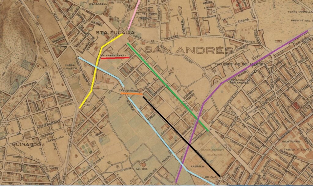 Mapa de 1929. En rojo la masía de Can Sitjar; en naranja el Mas Garrigó. En azul marino, la riera d’Horta; en negro la calle Escòcia; en verde, Fabra i Puig; en amarillo Els Quinze y en violeta la Meridiana.