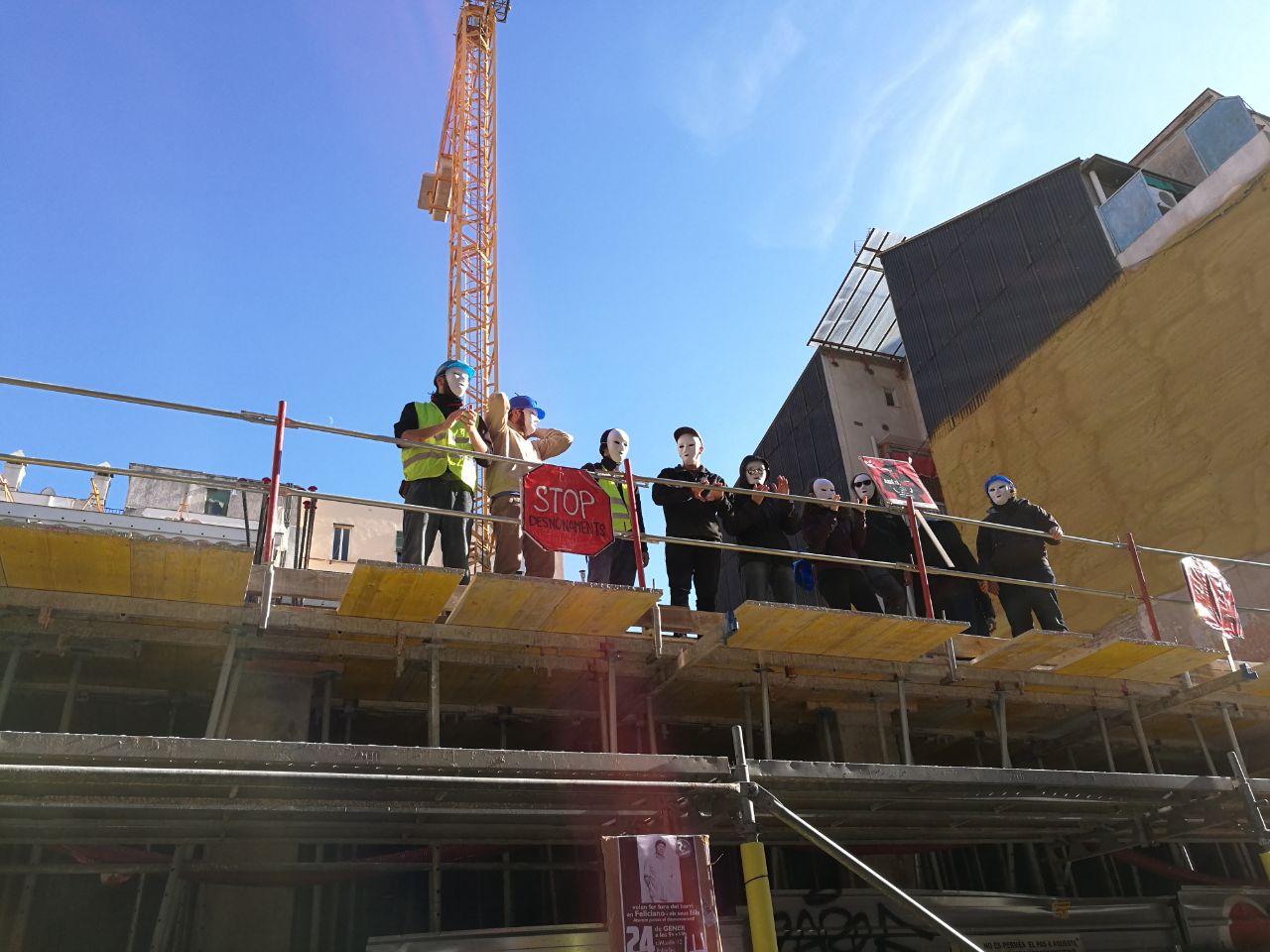 “Aquí se está construyendo un edificio de lujo donde no podrá vivir nadie del barrio. Esta obra queda paralizada hasta que se paralice el desahucio de mañana”, ha anunciado un miembro del Sindicato después de que diez personas enmascaradas hayan ocupado la primera planta del edificio. “Si Norvet S.L. no saca las manos de nuestro barrio, nosotros pondremos nuestros cuerpos”, ha agregado.