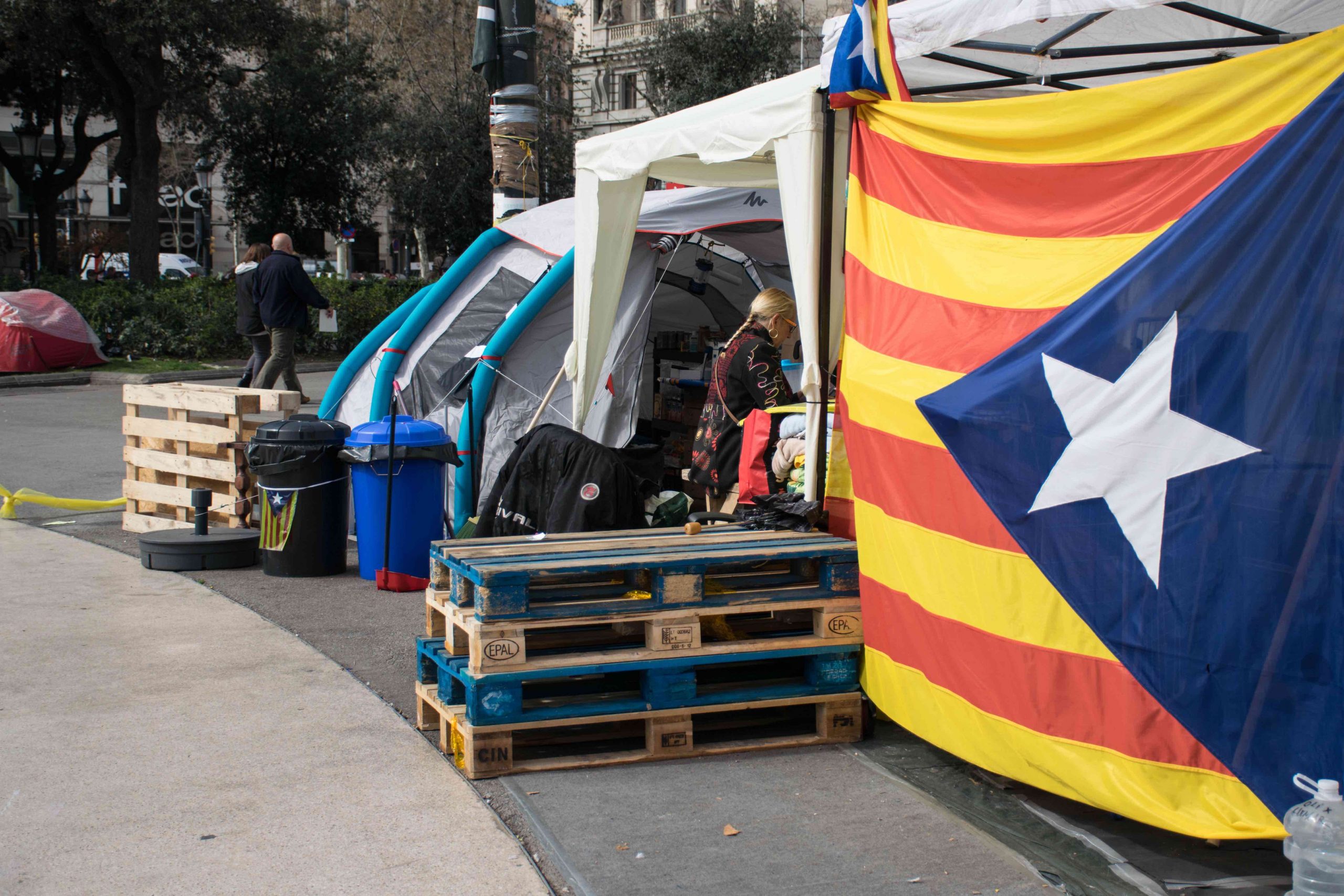Marta es una de las personas de la ocupación independentista autónoma –asegura no estar ligada a entidades ni partidos– y destaca que la función de la protesta de los suyos pasa por explicar “la injusticia catalana a los turistas que pasan por la plaza”. “Y ya está”. Mientras la joven responde a las preguntas, atiende una paradita de símbolos independentistas que la ocupación vende para ampliar la caja de resistencia. “La voluntad”, dice a un chico que mira unos pins con estelada.