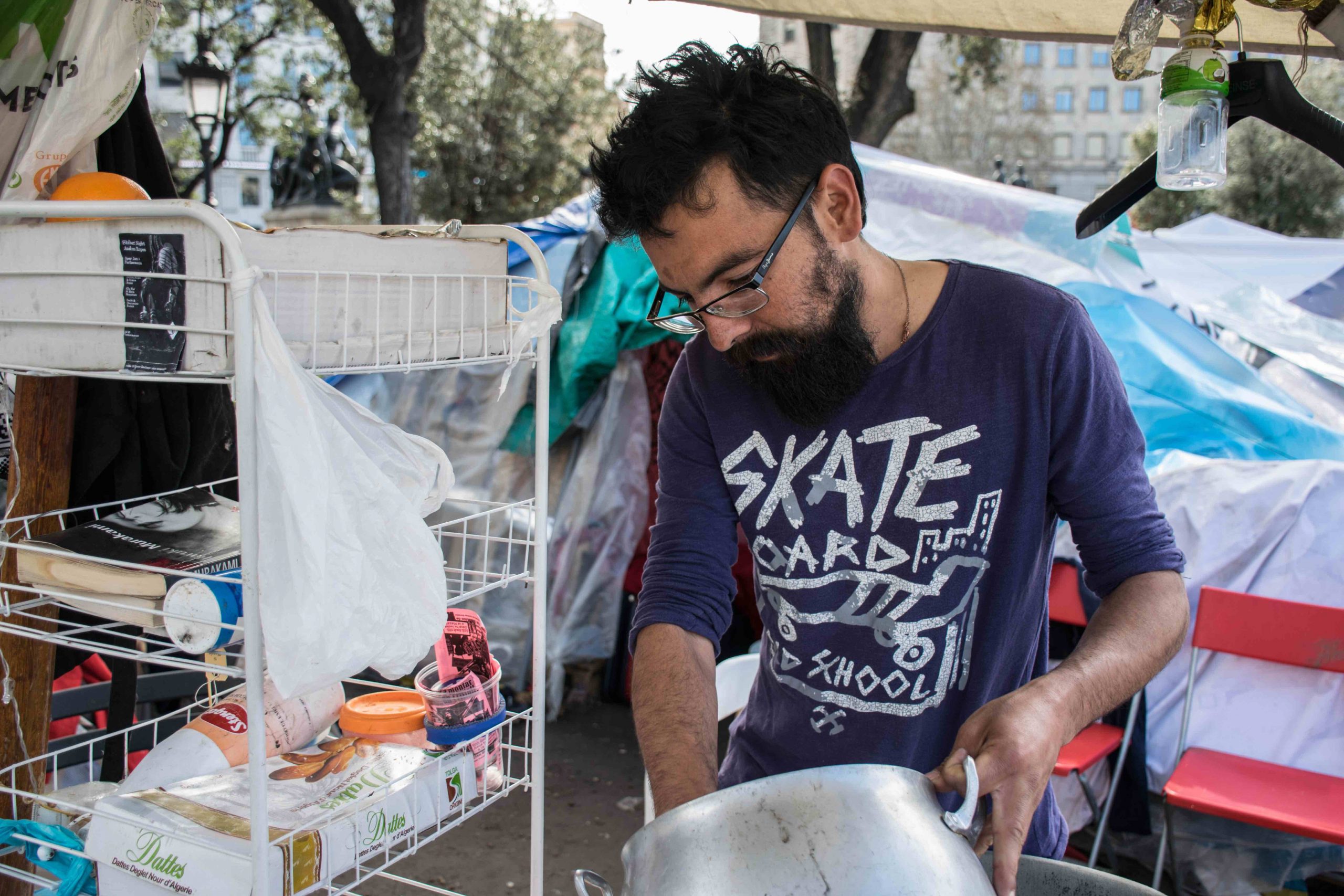 Miqui comparte la plaza, ataviada con tiendas de campaña, plásticos y telas, con unas 60 personas, entre las que se cuentan anarquistas, activistas vinculados a movimientos post-15M y otras causas solidarizadas con la Acampada x Derechos. Aunque si algo hay entre los acampados es gente sin hogar. De hecho, hace tanto que dura la acampada, que muchos se acercan simplemente para tener un lugar donde cobijarse. “Muchos llegan como náufragos… Sin nada, hambrientos. Y eso no puede ser. Estamos a favor de la independencia, pero no queremos ni un sin techo en ella”.