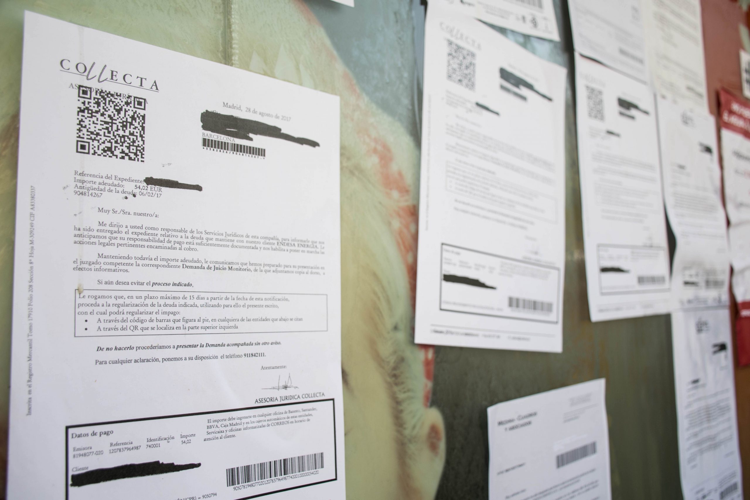 La APE ha empapelado la oficina comercial de Endesa con varias de las cartas enviadas por bufetes de abogados y empresas de recobro / SÒNIA CALVÓ