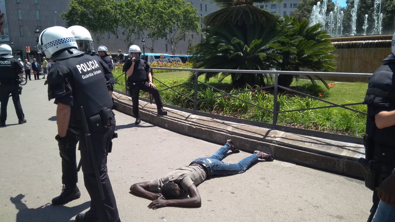 El calor trae consigo desmayos inusitados. Pero hay otro tipo de vahídos que son provocados. Así lo entiende al menos Tras la Manta, colectivo de apoyo a los manteros, que este miércoles al mediodía ha denunciado que un vendedor ambulante ha perdido el conocimiento en plaza de Catalunya tras el empujón de un agente de la Guardia Urbana (GU) en un operativo contra el top manta. El Ayuntamiento de Barcelona, en declaraciones a este medio, ha reconocido la intervención policial pero no el contacto entre el agente y el mantero herido.