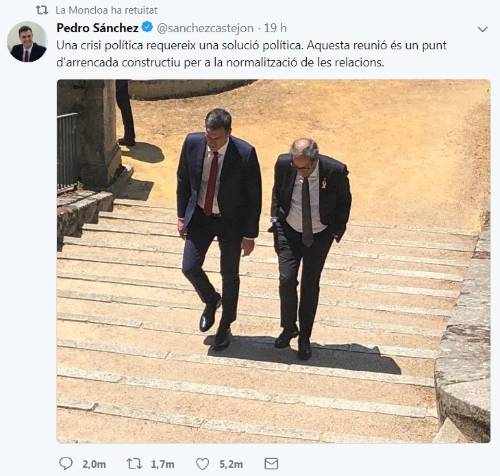 Parlem d’armes virtuals que han demostrat una prodigiosa capacitat d’escampar l’odi. Llegint els insults que li han dedicat a Torra alguns coneguts independentistes a través dels seus comptes de twitter i les admonicions apocalíptiques amb les quals alguns diaris de Madrid han saludat la iniciativa de Sánchez, penso que ahir va ser un bon dia. Repassant les preguntes que es fan avui els principals digitals independentistes sobre si Torra s’ha deixat entabanar o si la ratafía portava la poció d’algun druida català, penso que la reunió ha estat un encert.