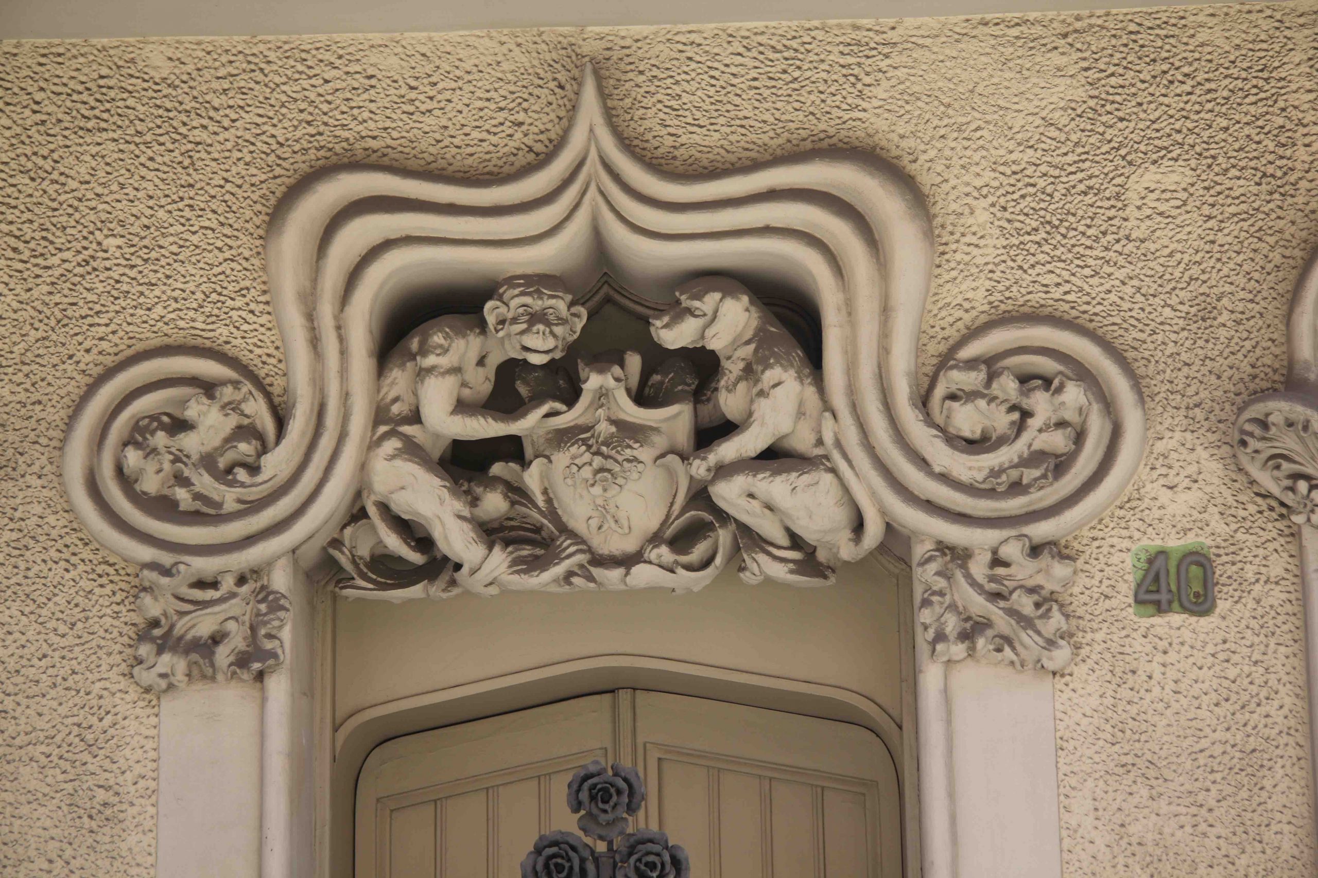 Si tornem a Camèlies, batejada així abans de 1900, trobarem al seu número 40 una preciosa casa modernista de 1905 que veïns i passejants coneixen com la del mico i el gos. Es troba ubicada a un indret especial, doncs llinda amb el passatge de Camil Oliveras, on sobreviuen els darrers vestigis de la vella Travessera de Dalt, abans quilomètrica i ara reduïda a un record sense tan sols identificació.