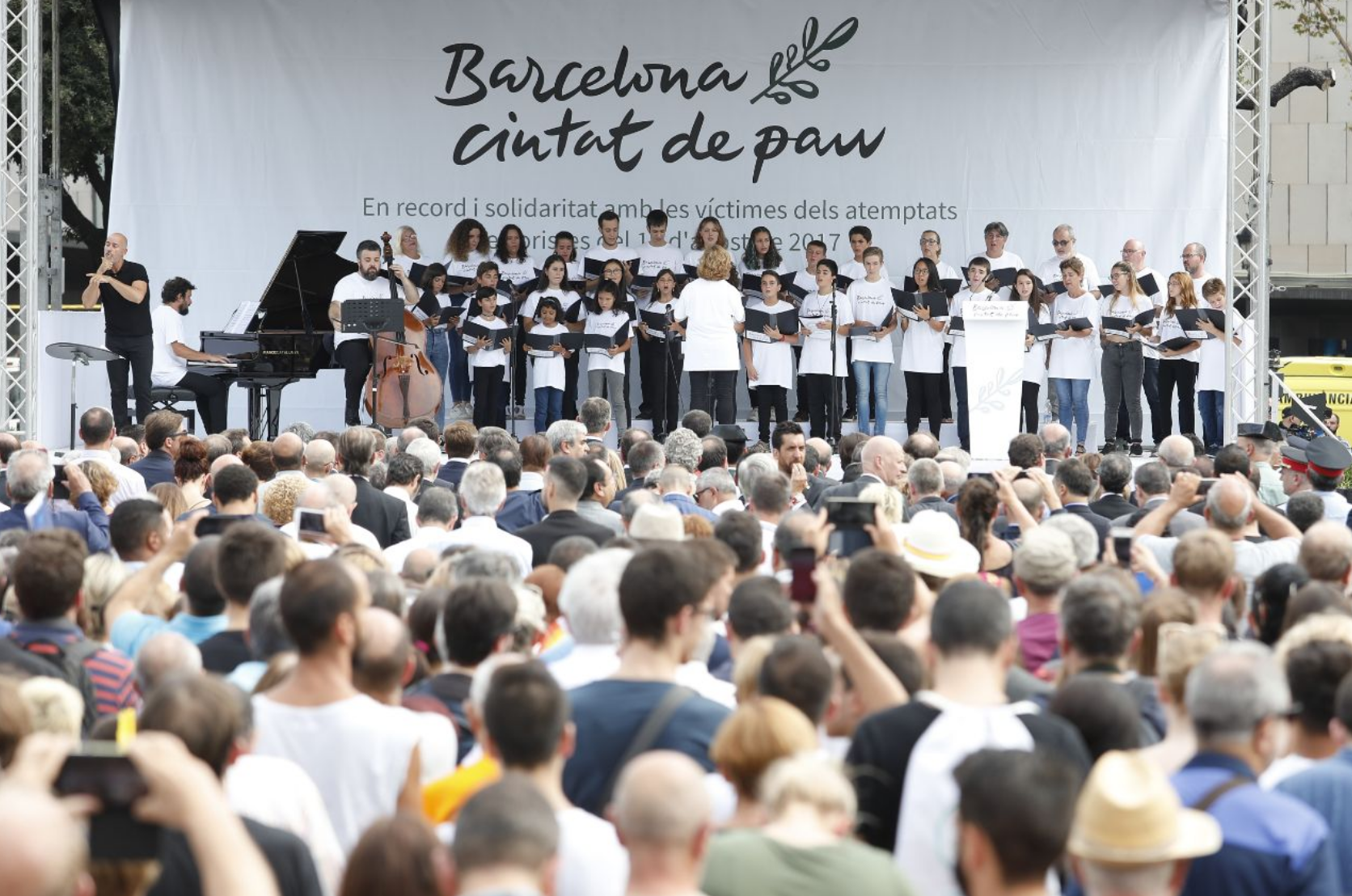 La música i la poesia per sobre dels discursos oficials. La reivindicació de la convivència, de Barcelona com a ciutat de pau, per sobre de la política institucional. Aquest ha estat el missatge que ha llançat la capital catalana un any després dels atemptats del 17 d’agost de 2017. En un acte solemne i escàs de paraules, el protagonisme a les víctimes s’ha imposat finalment al partidisme.