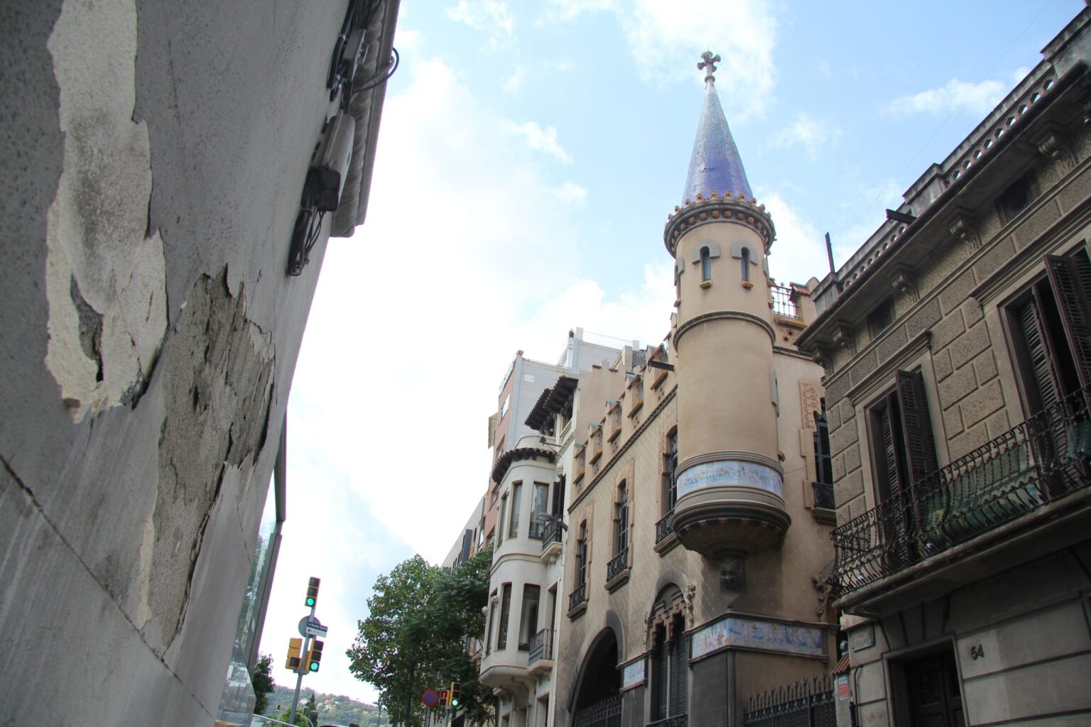 La casa Comas d’Argemir vio la luz en 1904 y su atractivo está por completo determinado a partir del terreno. Su ubicación en cuesta la convierte en un cuerpo descendente que, sin embargo, alcanza una de las cimas más originales del Modernismo mediante su coronación en una cúpula cónica recubierta de trencadís bañado de azul. Cada una de sus partes atesora méritos particulares de sabor inimitable. El prohombre quiso un castillo y su contratado se lo concedió para hacerlo sentir único. La puerta tiene un arco parabólico nada convencional que en su interior esconde un hermoso farol metálico y un rostro pétreo con tintes medio monstruosos, un cave canem más bien irónico. Las ventanas del piso superior hablan con el simulacro de almenas del último, mientras la del sector inferior es un juego magnífico, preludio de un friso de cerámica con niños angelicales enfrascados en quehaceres musicales, asimismo visibles en la base de la cúpula, imitada en una residencia de ancianos adyacente a la plaça de la Font Castellana.