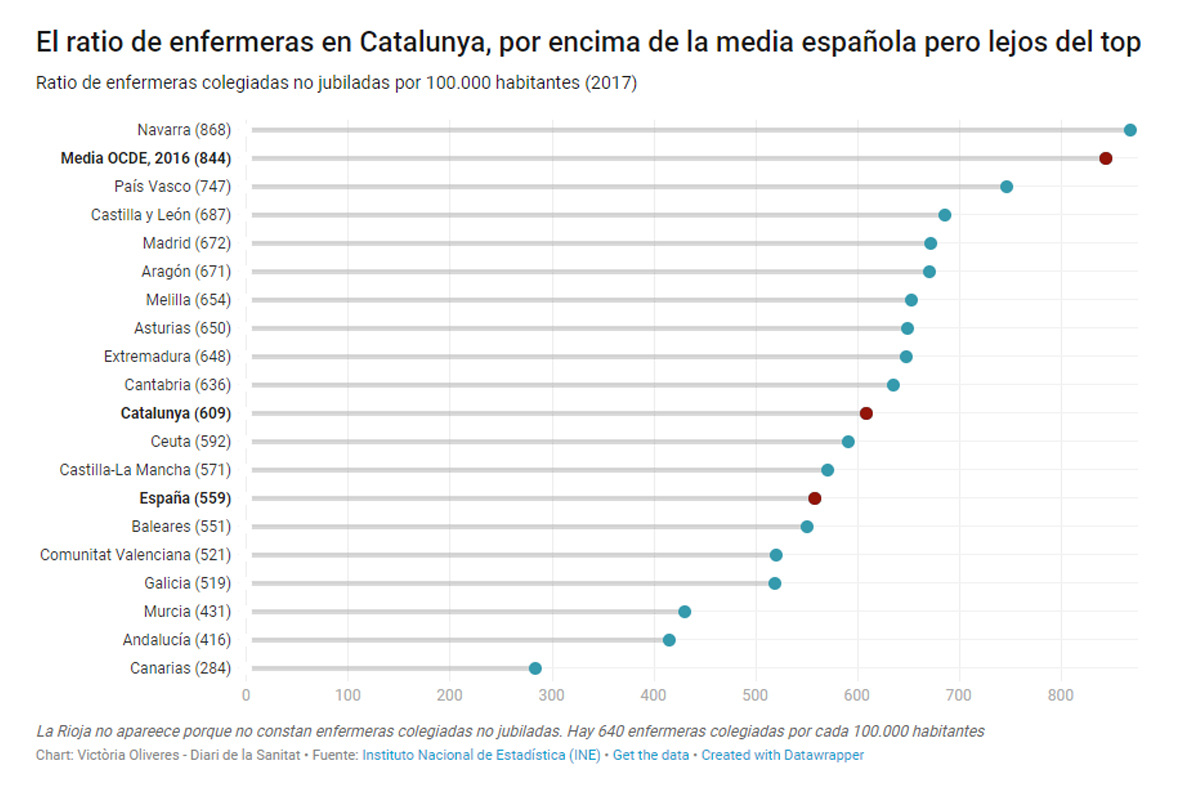 Como señaló la consellera de Salut, Alba Vergés, durante el I Foro de Diálogo Profesional, las ratios catalanas están lejos de la media de la OCDE que es de 843 enfermeras por cada 100.000 habitantes. Sin embargo, Vergés declaró que “no estamos mal si nos comparamos con otras regiones españolas de población similar”, aunque “estamos lejos de aquellas que tienen capacidad de financiación propia como el País Vasco (774) o Navarra ( 868) “.