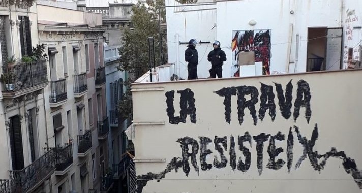 La mañana del jueves, el barrio de Gràcia de Barcelona se despertaba con un helicóptero sobrevolando los callejones del distrito. Poco después de las siete de la mañana, los Mossos d’Esquadra ejecutaban un desahucio que planeaba sobre el edificio okupado Ca la Trava desde septiembre. El bloque de pisos, donde vivían familias desahuciadas, jóvenes y estudiantes que sufrían la emergencia habitacional en uno de los barrios más caros de Barcelona, alargaron su estancia casi dos años: desde diciembre de 2016.