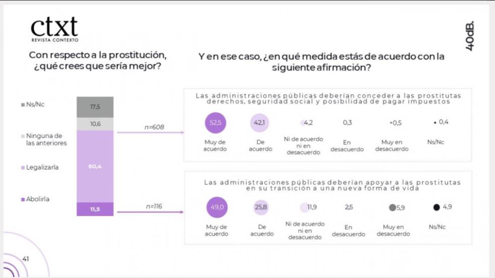 Pero las discusiones en las redes, el cruce de actos e incluso, -como se está viendo, la toma de acciones legales- no muestran un panorama de debate tranquilo. Sin embargo, desde el Sindicato apuntan que, aunque ruidoso, el apoyo al abolicionismo es “minoritario”. Esta postura es apoyada por una encuesta que la Revista Contexto presentó a las I Jornadas Internacionales Feministas, en la que el apoyo al abolicionismo sólo era del 11,5% (un 60,4% se definía regulacionista y un 28, 1% no se posicionaba). “Que el gobierno del PSOE se llene la boca diciendo que son feministas cuando su postura abolicionista sólo representa un 11,5% de la población me parece irresponsable. No gobiernan para todas las ciudadanas y ciudadanos del país”, opina Borrell.