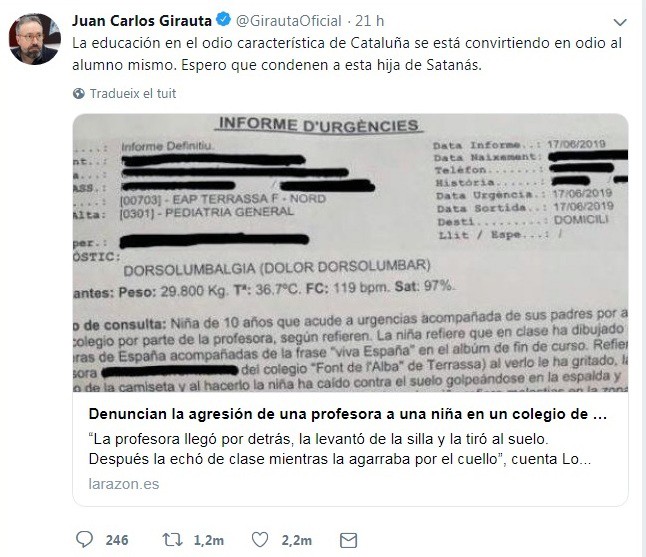 Els mitjans digitals més seriosos tapen el nom de la mestra, però d’altres pseudodiaris reprodueixen la versió de l’informe mèdic amb el nom seu complet. I aquest nom, i fins i tot la seva foto, no triguen a aparèixer a tuits de particulars o de trolls carregats de missatges d’odi. Si als diaris hi ha pocs matisos, a Twitter desapareixen totalment. Gairebé ningú adverteix que tota aquesta història encara s’ha de comprovar. La immensa major part dels qui vomiten odi li donen credibilitat absoluta. Juan Carlos Girauta, dirigent de Ciutadans, tuiteja: “Espero que condemnin a aquesta filla de Satanàs”. I, mentrestant, diverses entitats socials s’erigeixen en defensores de la presumpta víctima, encara que el nom varia segons quin mitjà en parli.