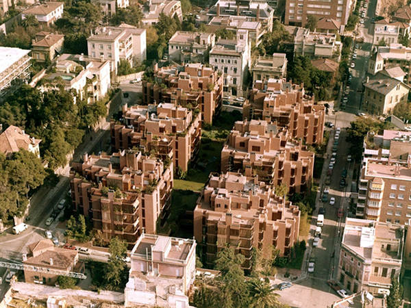 La parcela, de 100 metros de largo y 67 de ancho, se solucionó con seis bloques condicionados por el desnivel del terreno, por eso tres están compuestos de cuatro plantas más un ático, mientras la siguiente trilogía se dota de un piso extra. Las fachadas, excepcionales, se caracterizan por un revestimiento de plaquetas de cerámica prensada dispuestas en vertical, con ventanas en las esquinas y el uso de celosías de madera para controlar la luz.