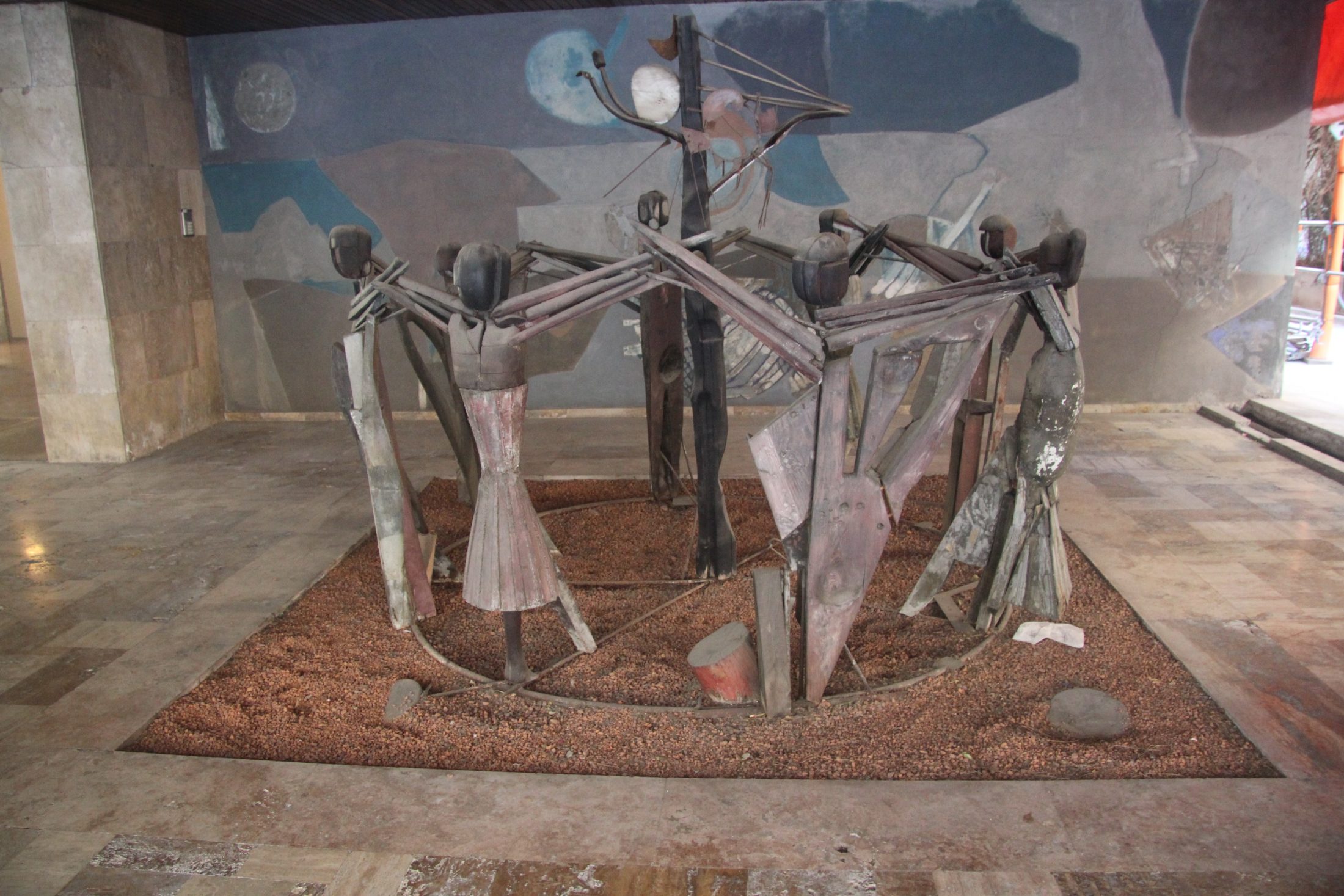 En medio de Bach está Coderch, muy reconocible. Antes de fijarnos en sus prácticas visitaremos el vestíbulo del número 11, donde podremos vislumbrar uno de los grandes crímenes de la escultura barcelonesa, la sardana de Josep Guinovart. Un domingo por la tarde el portero del establecimiento me cazó mientras le tomaba fotos y no me salvé de ninguna reacción virulenta porque el buen hombre estaba de acuerdo con mi alucinación ante esos alienígenas con las manos ajuntadas en una danza tribal; quizá eran prehistóricos y no leí bien la cronología. Pocos días después mostré el conjunto a unsi amigos y se embobaron positivamente. Pensé en una tomadura de pelo por eso de ser más bien de brocha gorda, pero nada, niente, nothing, rien, res de res, iban muy en serio y desde entonces apenas conversamos.