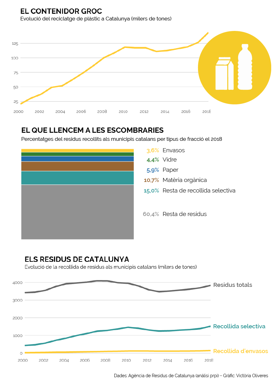 Gairebé tothom recorda la campanya de la Generalitat Envàs on vas?, que, amb una cançoneta enganxosa, explicava què hi havíem d’abocar al contenidor groc. Va ser una de les campanyes per impulsar el reciclatge, l’any 2012. Un any després, la producció de residus plàstics va assolir el seu pic més baix, però també va ser el període (2010-2013) en que menys es va reciclar a Catalunya i, per tant, el moment escollit per la Generalitat per fer la mítica campanya.