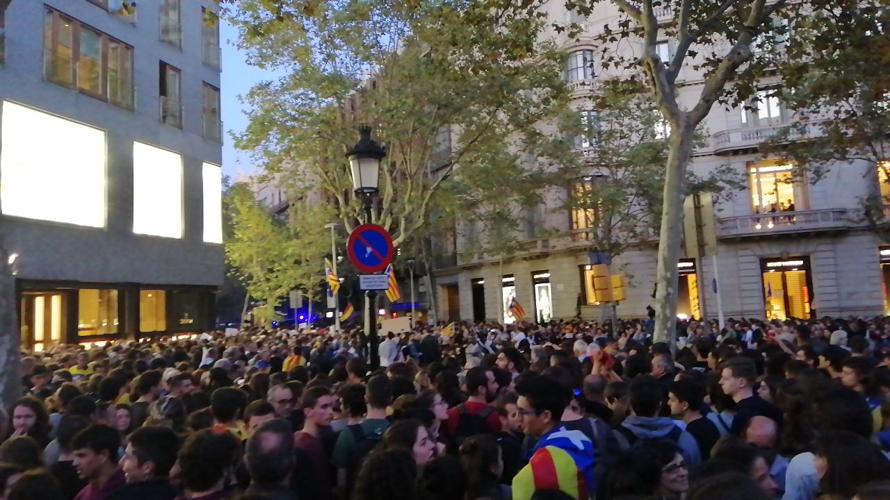 21:45h La Policía Nacional y los Mossos d’Esquadra han dividio a los manifestantes en diversos grupos, provocando carreras por Passeig de Gràcia y diversas calles adyacentes, que han sido cortadas por los manifestantes con, alrededor, de una decena de hogueras. Colectivos de atención a las víctimas denuncian que la policía dispara balas de goma y de foam por encima de la cintura. Sanitaris per la República habla de más de 55 heridos. El colectivo Alerta Solidària afirma que durante las concentraciones de esta noche en Barcelona se han producido tres detenciones.
