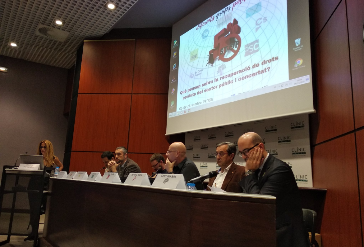 Durante el peor momento de los recortes asociados a la crisis, se aprobó una medida “excepcional de reducción de gastos de personal en la Administración y el sector público” que se basaba en la reducción del 5% de la retribución, según establecía el Real Decreto 8/2010. Siete años después de que la Generalitat aplicara esta medida, varios colectivos de trabajadores públicos crearon la Plataforma 5% i més, que trabaja para derogar esta medida y que, este miércoles organizó un debate electoral para abordar la situación de los trabajadores y trabajadoras públicas del país.