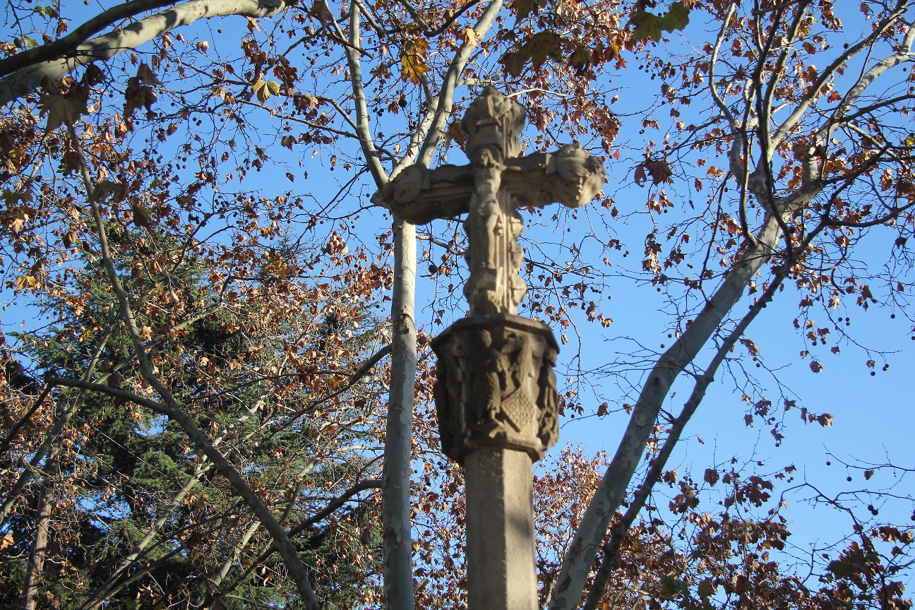 En la cima hallamos una cruz de término. La idea de la misma era marcar la frontera, otra más en este límite del pueblo, entre Horta y Sant Genís dels Agudells. La destruyeron en 1909 y 1936, siendo reparada en 1952 durante la celebración del Congreso Eucarístico, las olimpiadas del Franquismo, el gran evento planetario, ese fenómeno cíclico en la capital catalana, útil para realizar algunas reformas, reivindicar la mirada del resto del mundo y colocar símbolos en la periferia, como a posteriori hicieron los socialistas en el Carmel, justo antes de 1992.