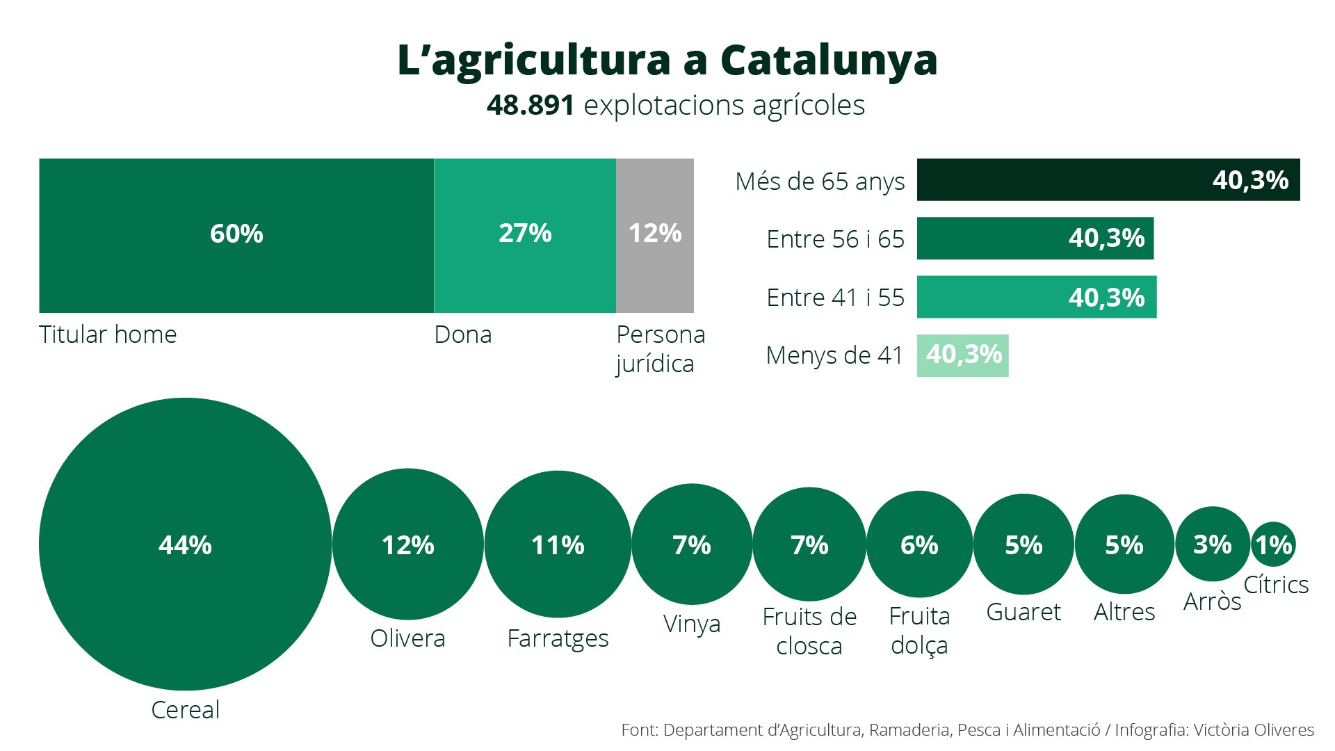Las explotaciones agrícolas, ya sean prioritarias como si no lo son, las gestionan 29.521 hombres y 13.558 mujeres. También hay 5.812 explotaciones el titular de las cuales son personas jurídicas, según recoge el Departamento de Agricultura, Ganadería, Pesca y Alimentación. En total, la agricultura y la ganadería emplean directamente a 53.000 personas en Catalunya, según los datos de la Encuesta de Población Activa (EPA), del cuarto trimestre de 2019.