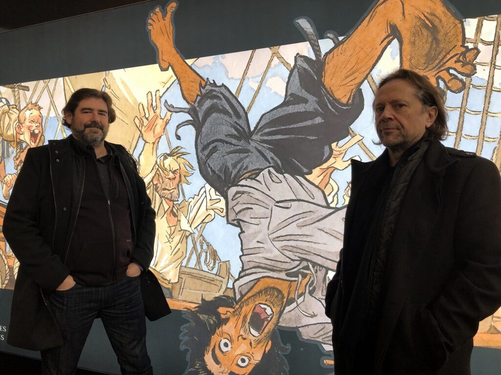 Ayroles (Saint-Céré, 1968) impregna el texto de toda su experiencia en sus series de capa y colmillos para organizar un sinfín de cabriolas y sorpresas y Guarnido (Granada, 1967), que lleva casi treinta años en Francia, perfecciona hasta un barroquismo exultante estas figuras singulares y paisajes exuberantes de los Andes y el Amazonas. Por ello, tuvo que abandonar momentáneamente los personajes animalistas de la serie de detectives Blacksad (los volúmenes 6 y 7 con Juanjo Díaz Canales están ya en preparación). La tarea para El Buscón en las Indias lo requería, porque con Ayroles tardaron cuatro años en terminar las 145 planchas para acabar convirtiéndolo en un libro objeto. Primero, apareció en agosto pasado en Delcourt la versión original francesa antes de que en noviembre saliera la versión en castellano en Norma Editorial. En el Festival de Angulema de enero, y pese a su ajetreo, conseguimos entrevistarlos entre firmas, encuentros con el público y sesiones fotográficas.