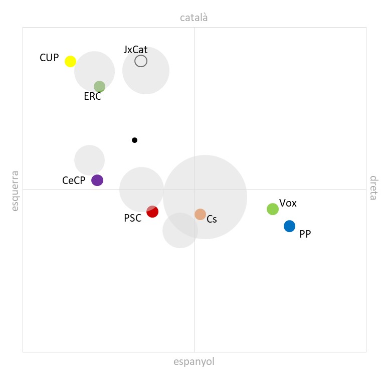 Los datos del último barómetro del CEO detectan claramente estos dos espacios donde se disputan los votos que aún no se han definido, los indecisos (las redondas grises en el gráfico). Dos grupos de magnitudes similares, según el sondeo de Gesop para El Periódico. En el espacio independentista, hasta cuatrocientos mil votos para decidir, suministrados casi a partes iguales por JxCat y ERC. Al otro lado de la gran zanja, un número similar de votos a ganar, en este caso todos provenientes del resultado extraordinario de Cs hace tres años.