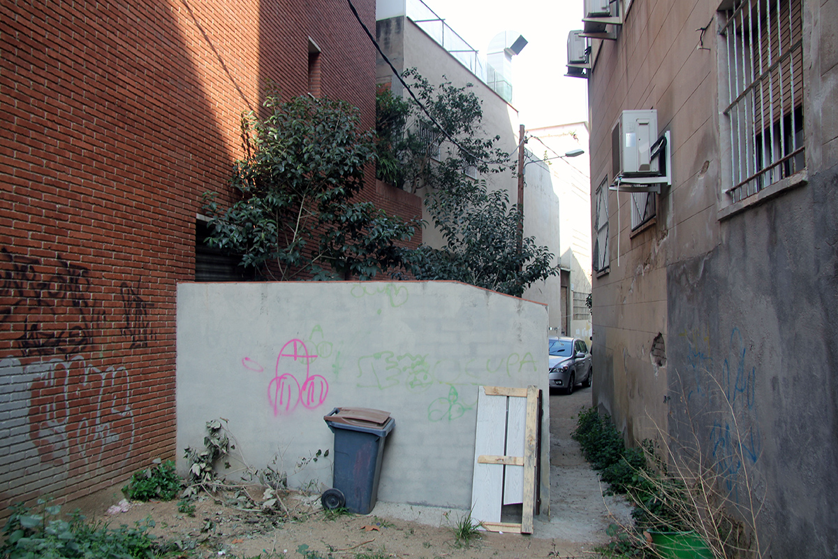 Ya iremos a esa cima. Ahora estamos en passeig Maragall. A la izquierda está Can Fargues, pero a la derecha encontramos el pequeño milagro de un camino de tierra en un estrato más bajo al de la calle. Es el Torrent de la Carabassa, una senda rota por una verja y con la extraña sensación de ingresar en una realidad paralela no solo por la arena del suelo, sino por la frondosa vegetación, la existencia de viviendas en su base, un muro con puntos para dar al entorno la denominación de calle más estrecha de la ciudad y una conclusión abrupta, casi salvaje.