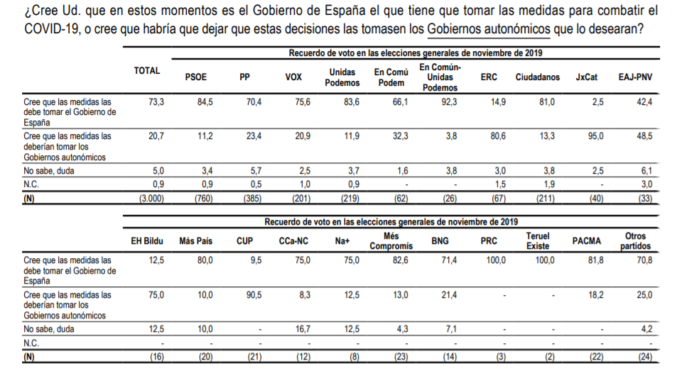 Para interpretar correctamente la siguiente pregunta hay que leer los resultados en clave nacional. Si bien la mayoría de la población consultada (un 73,3%) considera que debe ser el gobierno español quien tome las medidas adecuadas, los resultados varían mucho en función de los partidos políticos. Vistos de cerca, los datos muestran que tan sólo cuatro partidos opinan de manera contraria a la media: Junts per Catalunya, CUP, ERC y Bildu.