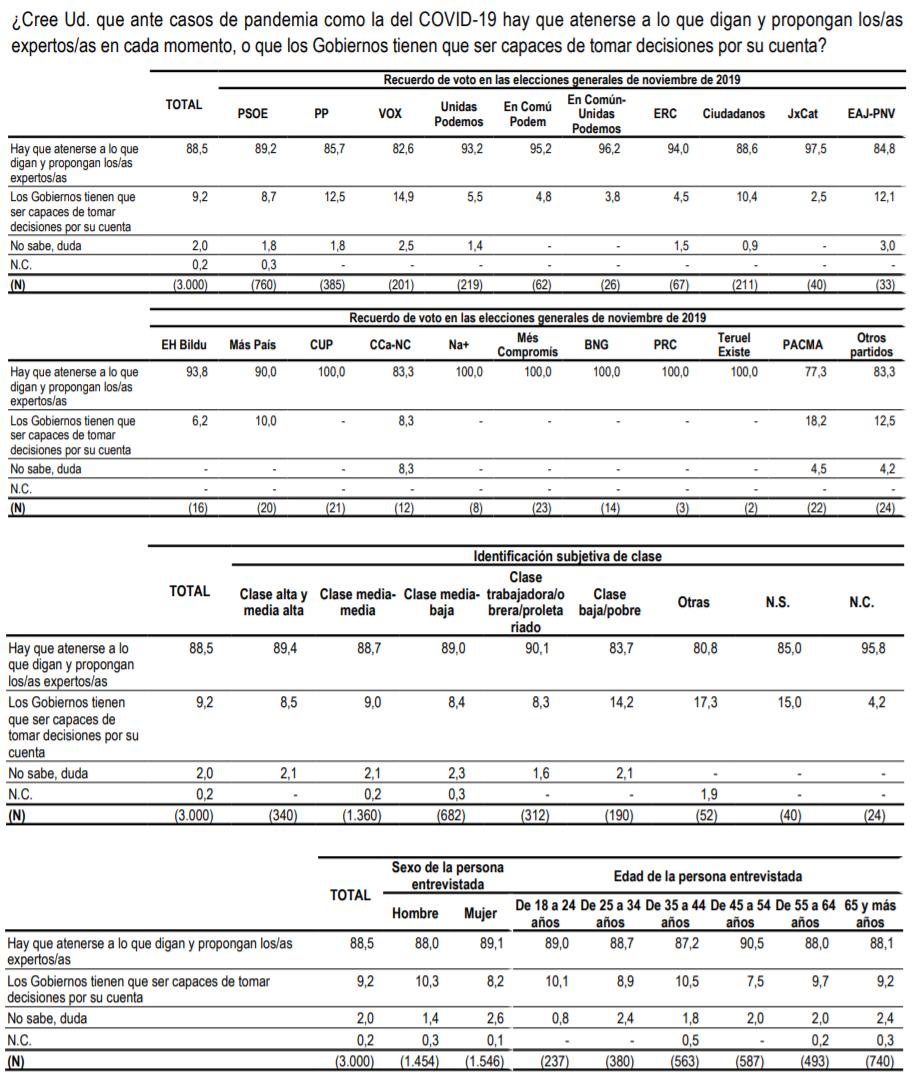 La respuesta a esta pregunta es una de las pocas en la que hay unanimidad entre clases sociales, entre sexos y entre diferentes votantes de partidos políticos. Así, a la pregunta formulada, un 88,5% de las personas encuestadas responden positivamente a favor de que sean los expertos quienes guien la actuación del gobierno.