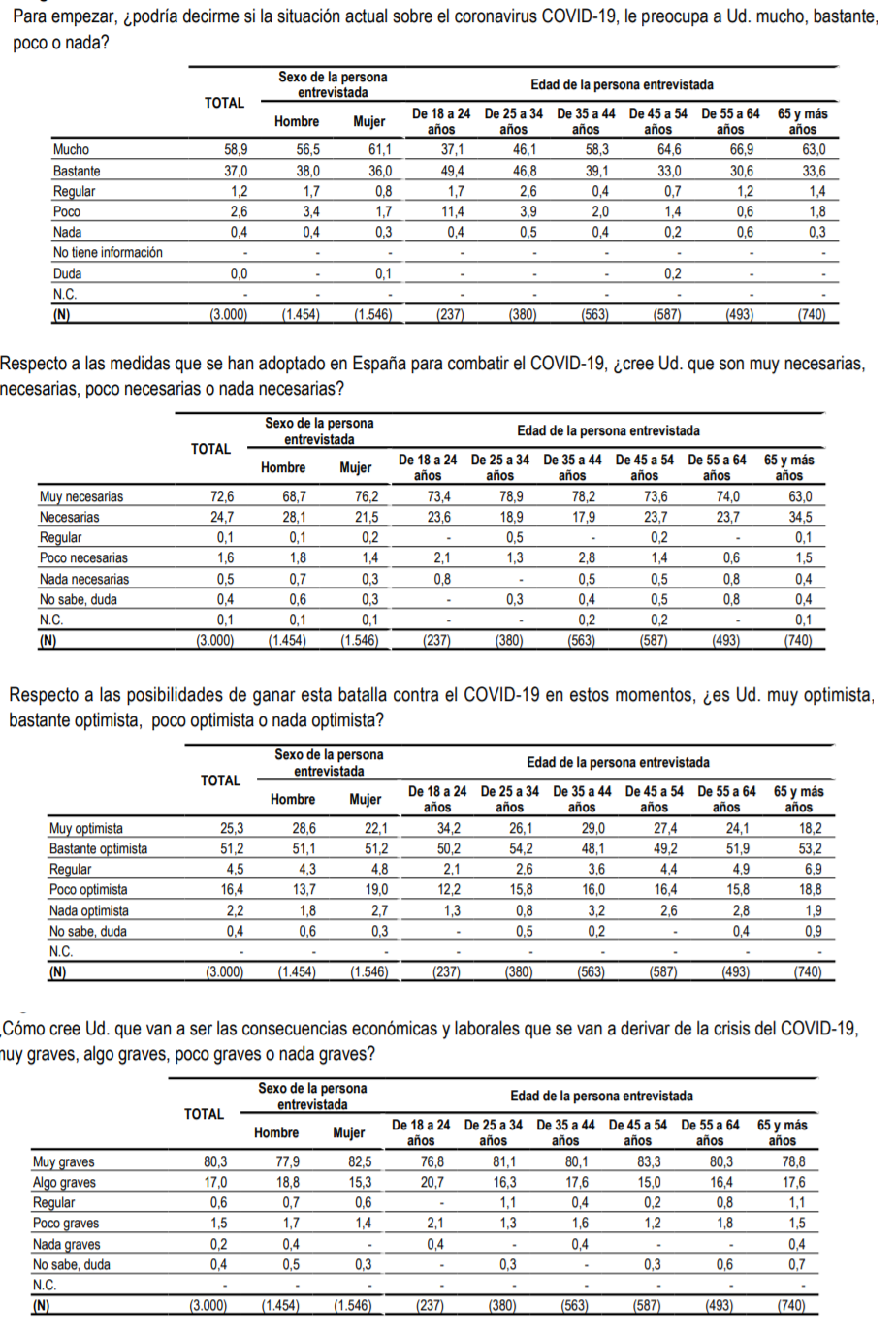 Analizando las respuestas disgregadas en función de sexo (hombre / mujer) los resultados muestran, de manera constante, una diferencia en la manera de percibir la situación actual. Por ejemplo, las mujeres se muestran un 5% más preocupadas que los hombres. También tres cuartas partes de las mujeres confían en que las medidas aplicadas en España para combatir la Covid-19 son “muy necesarias”. Es decir, que las mujeres parecen estar algo más preocupadas, y por lo tanto, consideran que las medidas de confinamiento son más necesarias.