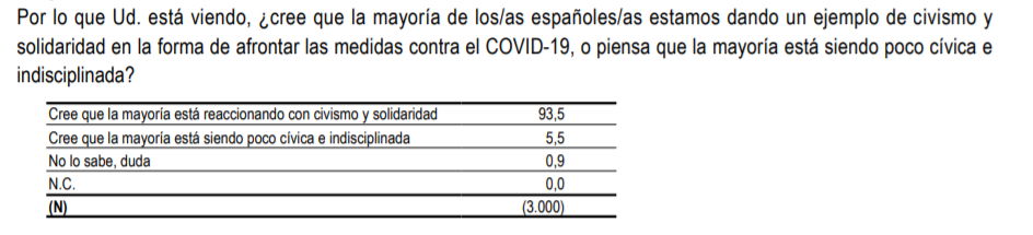 Estas imágenes, ocupando un espacio en los telediarios, ayudan a construir una idea de egoísmo y desconfianza que a menudo sirve para apuntalar y justificar una fuerte intervención policial. Pues bien, preguntados sobre si “los españoles damos ejemplo de civismo y solidaridad”, el 93,5% cree que sí. Una respuesta que ayuda a romper con este discurso del egoísmo y la desconfianza y que contribuye, en parte, a vernos como aliados ante esta extraordinaria situación que estamos viviendo.