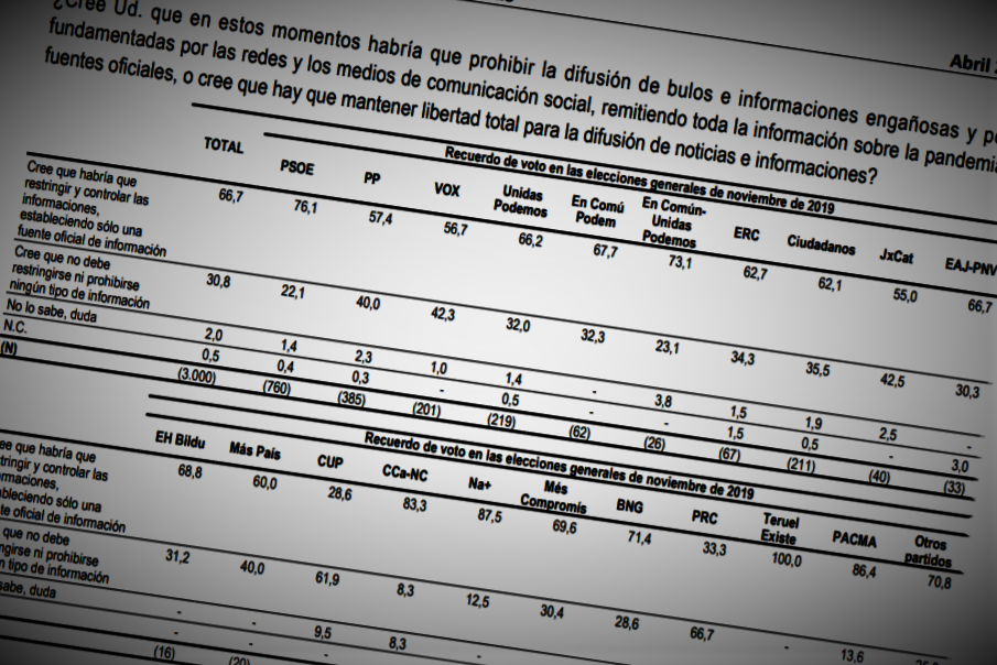 Uno de los datos que muestra el CIS y que más controversia ha generado es que, según los resultados de la encuesta, en estos momentos dos terceras partes de la población (66,7%) estarían dispuestas a que se controlaran y restringieran las noticias, estableciendo una sola fuente de información oficial. La pregunta era la siguiente: