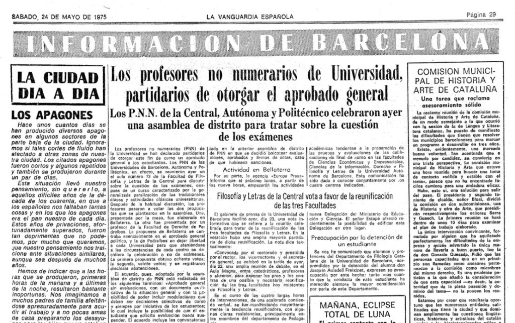 El curs 1974/75 es produeix la vaga més llarga que ha viscut mai la universitat espanyola. Arrenca el mes de febrer del 75 i ja no acabarà fins cinc mesos després, amb el final de curs al juny. Va ser una vaga protagonitzada pels que aleshores es coneixien com a professors no numeraris (PNN o penenes), professorat no funcionari la presència del qual havia anat creixent de forma exponencial a les universitats espanyoles durant el decenni anterior per donar resposta a l’increment de l’alumnat. Aquests professors feia anys que reivindicaven una millora en les seves precàries condicions laborals, així com un canvi en les formes i estructures de govern de les universitats, estretament tutelades pel règim. El novembre de 1975 mor Franco. La universitat franquista encara aguantarà alguns anys més, i el moviment PNN (que estranyament compta amb molt pocs treballs de recerca) serà una de les principals palanques de canvi.