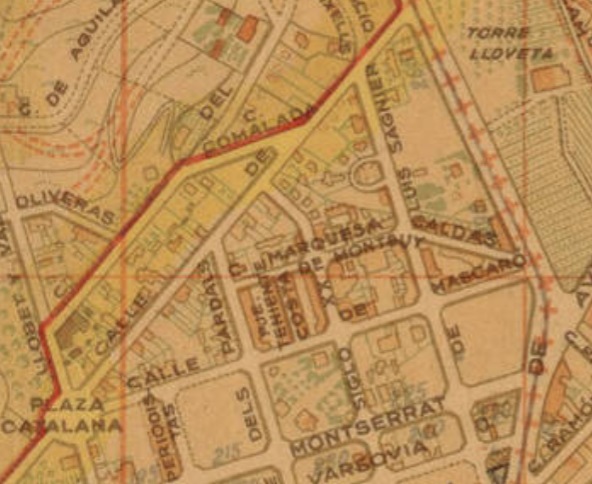 Al principio desciendo por Mascaró, nombre de uno de los grandes terratenientes de esas parcelas, con un castillo, que comprendía las esquinas de Verge de Montserrat con Garriga i Roca y Sales i Ferré, y desde aquí recomiendo apreciarlo desde la superficie y con algún programa informático para ver cómo su forma ha resistido entre bloques, pasajes y escaleras.