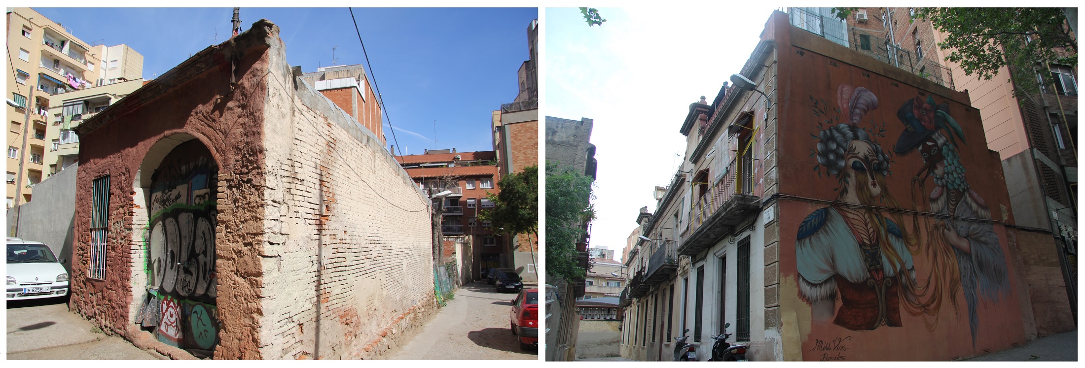 Des de l’inici d’aquesta sèrie l’examino el màxim possible. La prospecció a l’aire lliure m’ha ajudat moltíssim, més encara per trobar-nos en aquesta estranya època, doncs gràcies al seu silenci i solitud l’he comprés millor. L’altre inevitable i gran recolzament han sigut les poques fotografies disponibles del Nou-Cents; a una s’aprecia amb certa nitidesa el seu ingrés tallat, com deia a la primera entrega, per la successora de la residència d’ancians Sant Josep Oriol. Un petit mur surrealista, amb la ronda del Guinardó d’aleshores gairebé a tocar, ens mostra quin podia ser el seu traç des del desaparegut carrer de la Bona Sort.