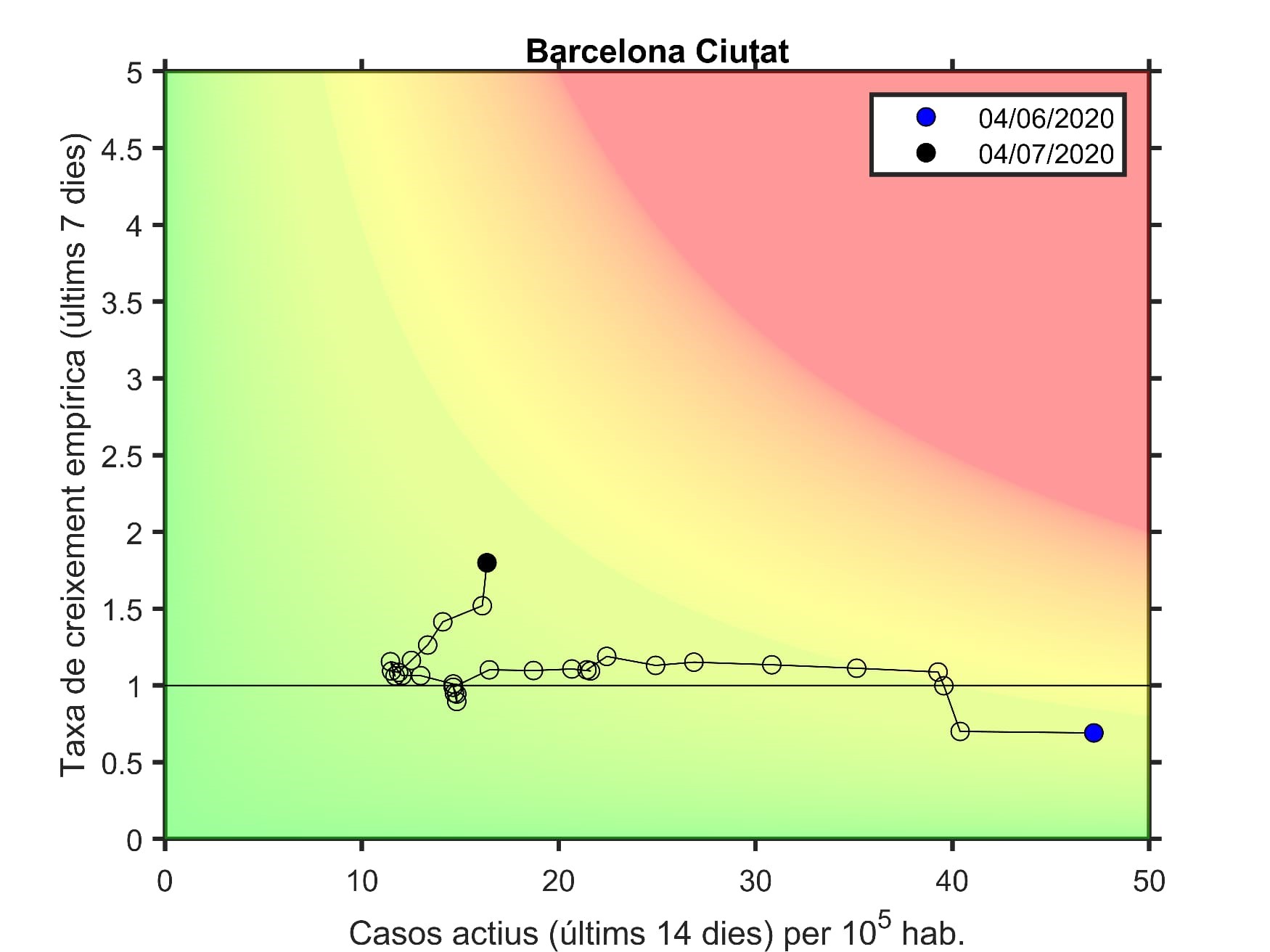Como muestra, los diagramas de riesgo que utiliza el grupo de investigación BIOCOM-SC para valorar la situación aún sitúan Barcelona en la zona verde, en la que “los nuevos casos deberían ser perfectamente controlables” para la atención primaria y la resto de la sanidad pública, según el criterio del grupo.