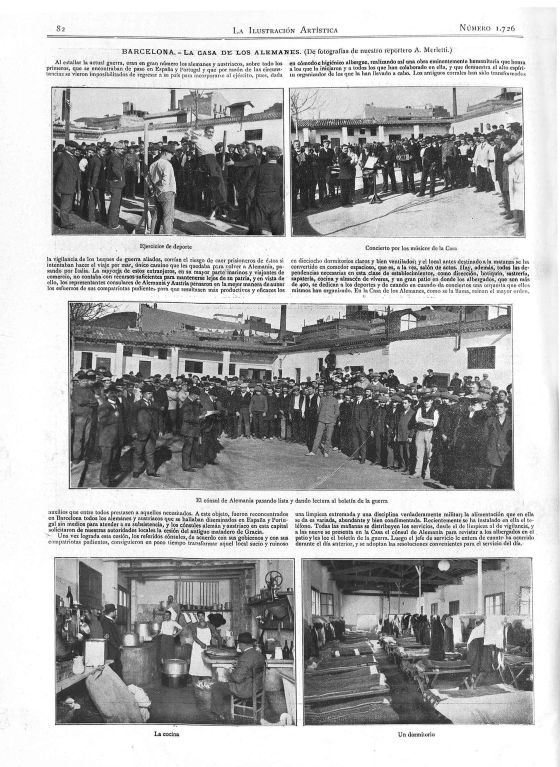 El 25 de gener de 1915 s’inaugurà la Casa de los Alemanes, un eufemisme de camp de refugiats, això sí, amb sala d’actes, sastreria, sabateria, hospital i menjador. Els residents s’avorrien del confinament i aprofitaven la rodalia amb Gràcia per a endinsar-se als seus racons i causar aldarulls, denunciats als governador Andrade per les joventuts del Partit Radical d’Alejandro Lerroux i els veïns de la Vila; el 9 de juliol de 1915 el sereno Josep Feu intervingué a la cruïlla del carrer Torres i Milà i Fontanals, on trenta alemanys insultaven als vianants; com ho volgué impedir es llençaren a sobre seu, apoderant-se del seu xuixo, i un cop el recuperà pogué detenir a dos joves de vint-i-nou i vint-i-un anys, amb el barceloní Esteve Moragues ferit al cap.
