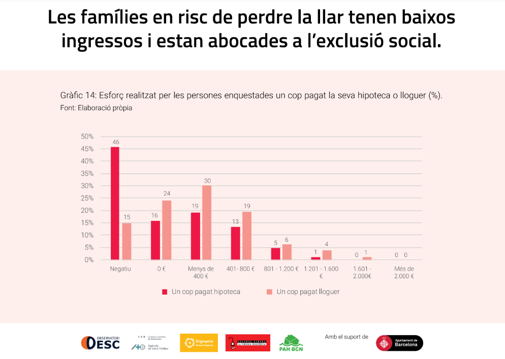 En este informe, que recoge 452 encuestas a personas llegadas a la PAH y la APE después de 2017, sale a la luz que el 50% de las personas encuestadas sufren dos de las tres vulnerabilidades analizadas (acceso a la vivienda, pobreza energética e inseguridad alimentaria). Esta situación de crisis permanente hace que el 88% de las mujeres encuestadas y el 71% de los hombres sufran una mala salud mental (mientras que las cifras del conjunto de la población en Barcelona son del 19,5% y el 14,5%, respectivamente).