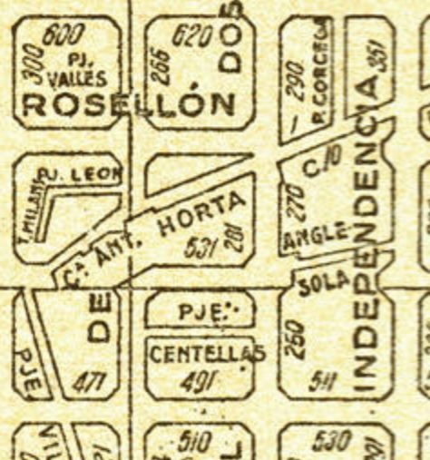 Es la única baja del perímetro estudiado hasta ese momento, y eso es otra pieza más del rompecabezas al apuntarnos como este trecho de Freser es anterior al mismo de Rosselló, algo asimismo verificable por el insulso passatge de Còrsega, vínculo de esta calle con Freser, quien sabe si desde antediluvianas relaciones rurales, siempre al acecho en este limbo entre Guinardó, Camp de l’Arpa y el barrio de la Sagrada Familia, y lo digo así pese a ser para muchos Eixample sin más.