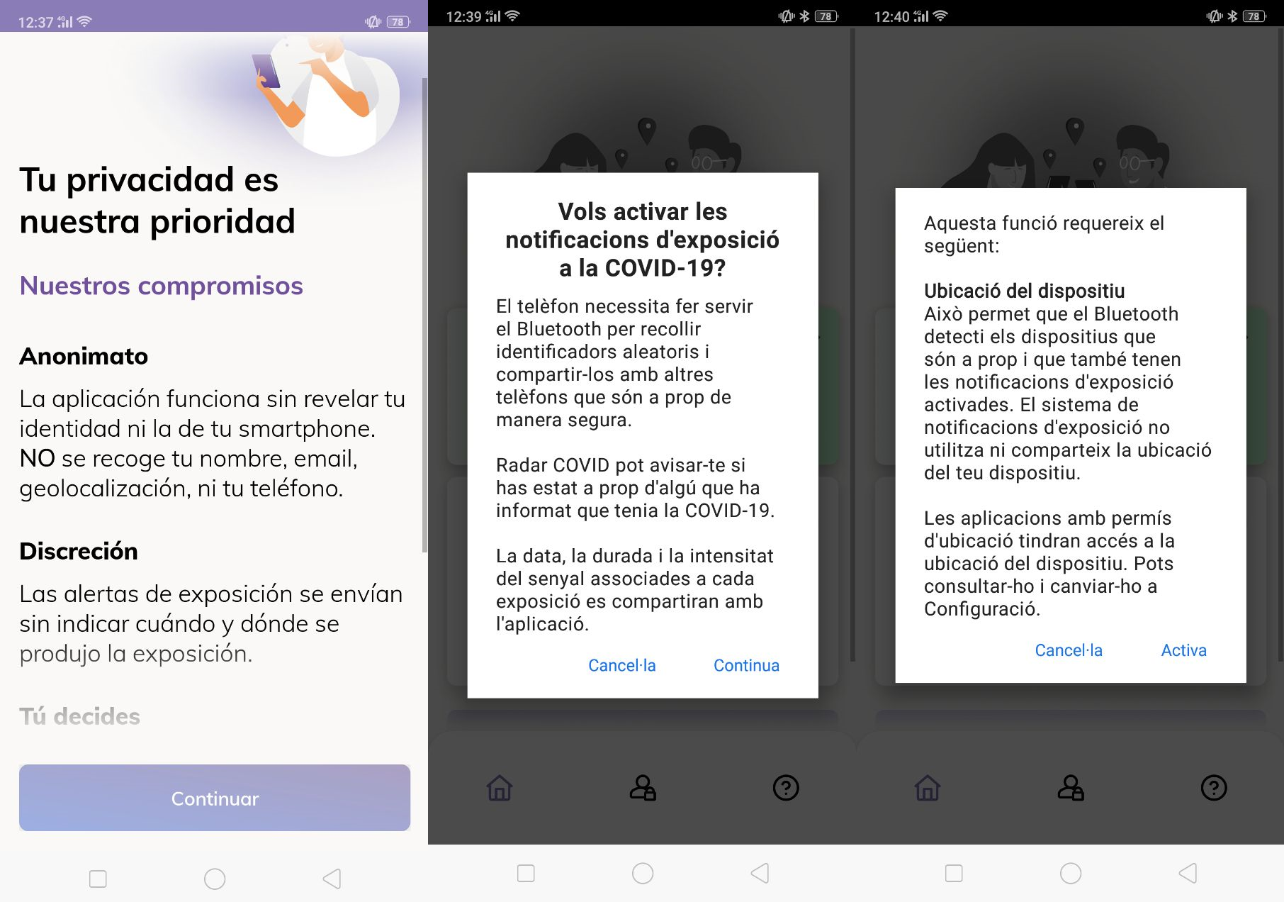 “Tu privacidad es nuestra prioridad”. Así reza la primera pantalla de Radar Covid, una vez se ha instalado. La aplicación informa que “funciona sin revelar tu identidad ni la de tu smartphone. No recoge tu nombre, email, geolocalización ni teléfono”. Es cierto que no pide ningún permiso a la hora de ser instalada, pero la cosa cambia cuando la app se pone en marcha. “Activa tu Bluetooth. Eso es todo lo que te pedimos”. Eso ya no es tan cierto. Y es que cuando se activa la función, aparece un pop up en la pantalla del teñléfono que informa de que la aplicación “requiere la ubicación del dispositivo”.