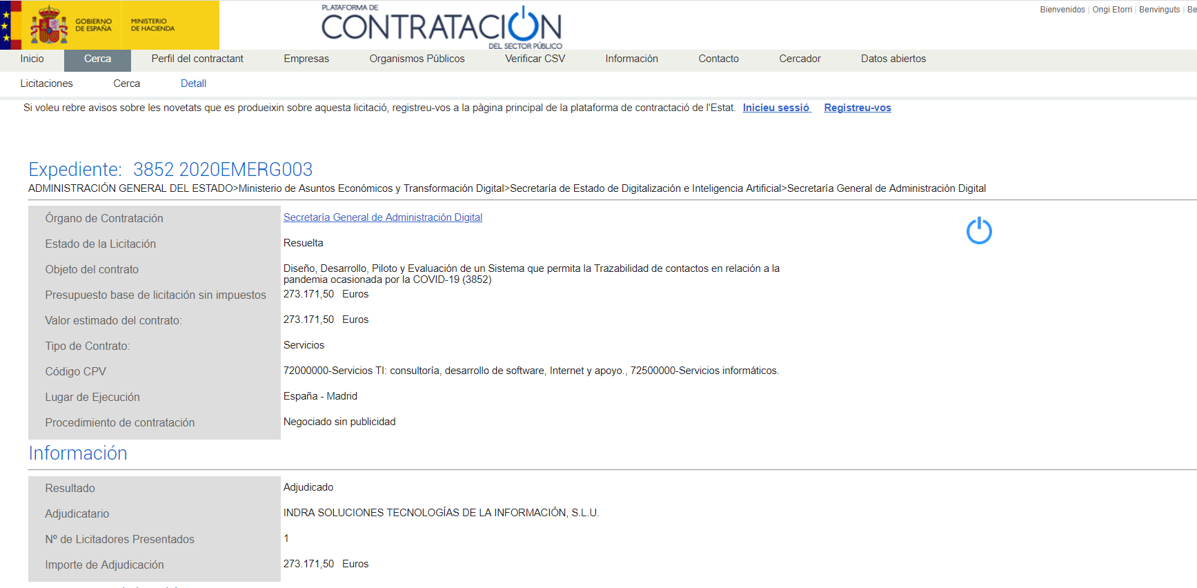 Pero lo interesante en el contrato no está en el cuánto, sino en el cómo. Indra se alzó con la adjudicación mediante una tramitación de emergencia y un negociado sin publicidad. Esto quiere decir que, en el contexto de emergencia pandémica (justificado mediante el artículo 16 del Real Decreto ley 7/2020 del pasado mes de marzo), la administración puede negociar directamente con los posibles contratistas sin que se les pueda exigir publicar el expediente de contratación, ni los plazos, ni los candidatos ni ningún requisito de procedimiento. Todo ello, para poder contratar a la empresa que, según la administración, pueda cumplir la tarea lo más pronto posible. En aras de actuar rápido contra el virus. Ahora bien, la tramitación de emergencia sólo afecta a los requisitos y tempos previos a la firma del contrato, por lo que éste debería haber sido público desde el día 15 de junio.