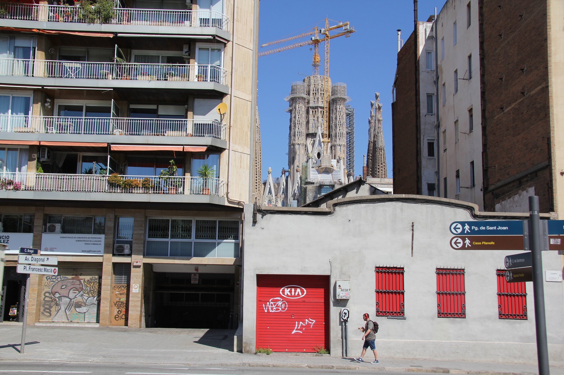 La suerte de su emplazamiento en el mapa lo asocia, dos cuadras arriba, con la Sagrada Familia, visible en una panorámica bastante insólita, fea para Instagram y muy útil para aprehender la formación de la ciudad. En un planisferio de 1890 damos con una clave, el torrent de Delemús, un riachuelo proveniente del turó de la Rovira, descendiente por Can Baró, su rastro es apreciable en el cortado passatge de Vallseca, hasta transitar por el actual parque de las aguas, seguir su curso en otros sitios troceados, el passatge de Mariné al lado del carrer de l’Encarnació, saludar a la homónima masía en travessera de Gràcia con Sardenya y luego avanzar justo hasta el carrer Aragó 425.