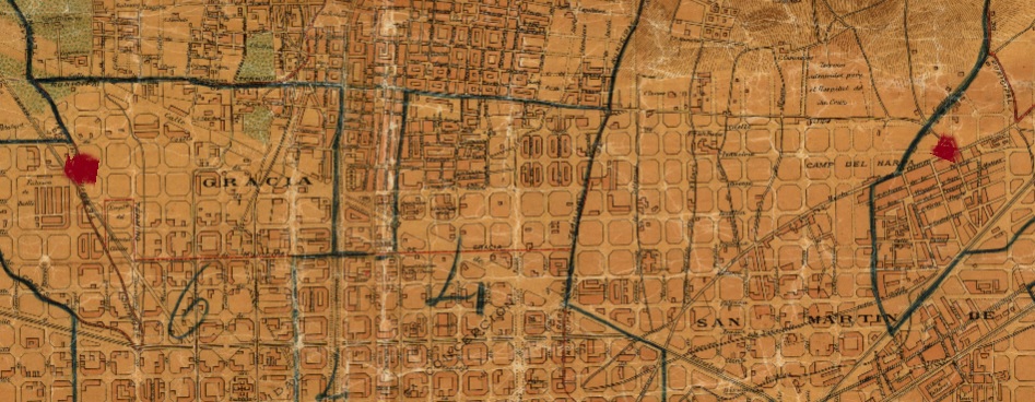 Iré a la punta más alejada de mis dominios. En un mapa de 1891 el carrer de la Industria debuta en una intersección de caminos, con la riera de Magòria bien destacada. En 1931 podemos discernir más sobre su trayectoria por las reformas de esa zona. En ese instante el carrer París, así bautizado en 1922 para romper con la continuidad de Industria, salía de la plaça del Centre y moría en La Diagonal. Tras la guerra, como expliqué no hace mucho en estas entregas barcelonesas, los vencedores quisieron rendir homenaje a la Alemania Nazi y un tramo dedicado a la capital francesa pasó a glorificar la del Tercer Reich.
