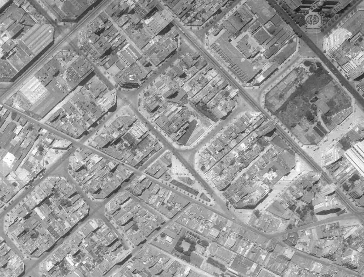 Mapa de la zona el 1961 donde aún se aprecia la fábrica de Pianos Cussó, penúltima manzana desde la derecha. Institut Cartogràfic de Catalunya
