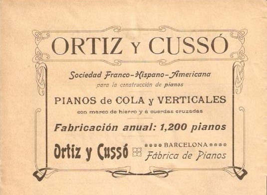 La empresa Pianos Ortiz&Cussó se afincó en Barcelona hacia 1898, convirtiéndose en 1904 en Ortíz&Cussó S.F.H.A; en su momento de mayor esplendor construía más de mil instrumentos anuales. Muchos se exportaban a Ultramar y al resto de Europa, en ocasiones con el cebo de un prestigio tocado por las mayores concertistas del primer Novecientos, como Joaquim Malats, Enric Granados, Isaac Albéniz, Gabriel Fauré o Camille Saint-Saëns.