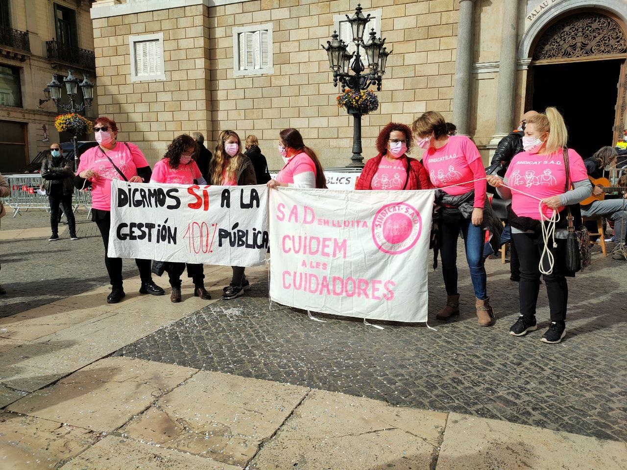 Trabajadoras del SAD Barcelona en la concentración de plaza Sant Jaume |