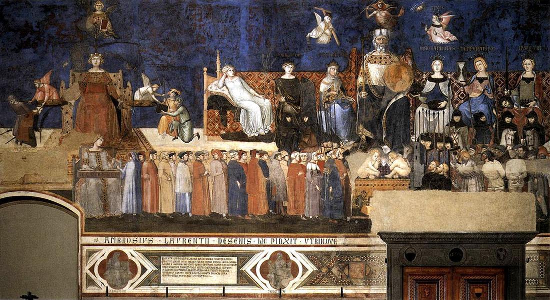 Els frescos del bé comú, o del bon i el mal govern, cobreixen els murs de la Sala dei Nove, on es reunien els membres del govern de la República de Siena i van ser realitzats, en estil gòtic, en el moment de màxim apogeu de riquesa i poder de la Ciutat. Aquest govern encarrega als germans Lorenzetti la creació d’un programa iconogràfic que mostrés als ciutadans que la República era la millor manera d’organitzar el poder, alhora que recordés als governants quins eren els ideals a seguir: que el bé comú estigués per damunt del seu interès particular.