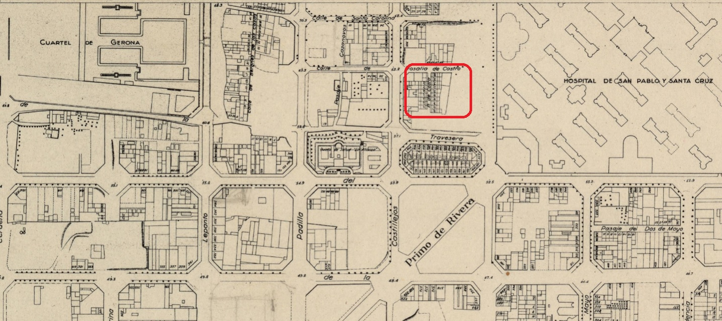 He insistido mucho en la impostura de un Eixample unitario. Aquí, en pocos metros, podemos comprobarlo sin muchas dificultades. A principios de esa década las cooperativas militares empezaron a mover ficha para igualar en influencia lo hospitalario. Además del cuartel de Lepanto se iniciaron, desde el admirable fenómeno de las casas baratas, las cooperativas militares, y una de ellas se mantuvo entre Cartagena, Pare Claret, Castillejos y travessera hasta la década de los sesenta. Justo a su vera un señor llamado Josep Costa i Pujol adquirió terrenos a uno de los grandes propietarios del entorno, Josep Sivatte.