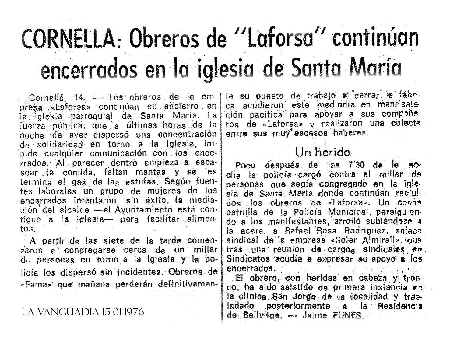 El 13 de enero casi toda la plantilla de Laforsa se encerró en la iglesia de Santa María de Cornellà, con el visto bueno del párroco Salvador Torres. Desde el campanario, vieron como centenares de personas se iban acercando en señal de apoyo y como las mujeres de los operarios desfilaban con las chaquetas azules de sus maridos, mientras la Policía, que había rodeado la iglesia, las obligaba a retirarse. “Los amigos y las mujeres nos llevaban comida. La Policía no lo permitía, pero cuando los agentes iban hacia un lado, ellas entraban por el otro, y con cuerdas y ganchos conseguimos que entrara la comida”.