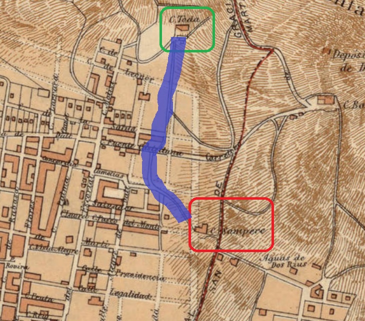 Mapa de 1891. En rojo Can Sampere, en verde Can Toda y en azul el camino entre ambas, con la conexión final del antiguo camino de la travessera